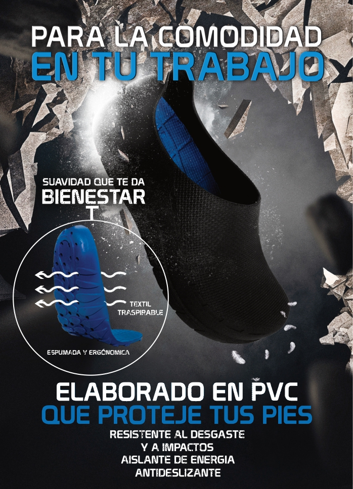 Compuesto de PVC de alta flexibilidad y buen comportamiento al desgaste, diseño antideslizante muy apropiado para superficies lisas y con humedad. Incorpora en zona de taco la tecnologia tunnel system permitiendo la absorcion de impatos, reduciendo asi dolores y fatigas en su uso por periodos prolongados